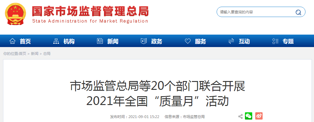 2021年9月,市场监管总局联合中央宣传部、国家发展改革委、教育部、科技部、工业和信息化部、公安部、自然资源部、生态环境部、住房和城乡建设部、交通运输部、水利部、农业农村部、商务部、文化和旅游部、国家卫生健康委、人民银行、国务院国资委、海关总署、供销合作总社等20个部门,共同部署开展2021年全国“质量月”活动。